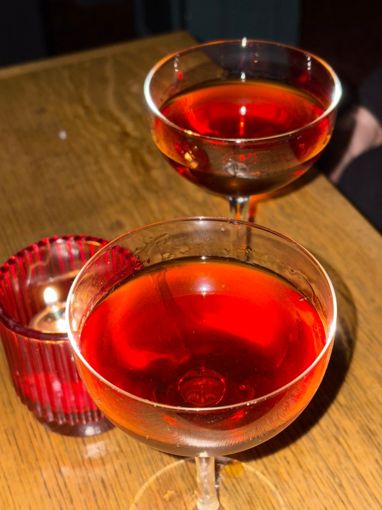 We sat at a table between the bar and the washroom. The green print wallpaper, framed photos and lamps give a calming 1920’s vibe, like you’re sitting in your fancy aunt’s parlour, but it’s loaded with booze.