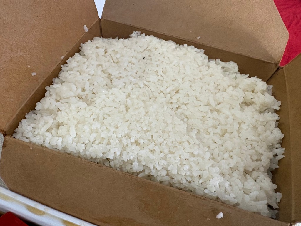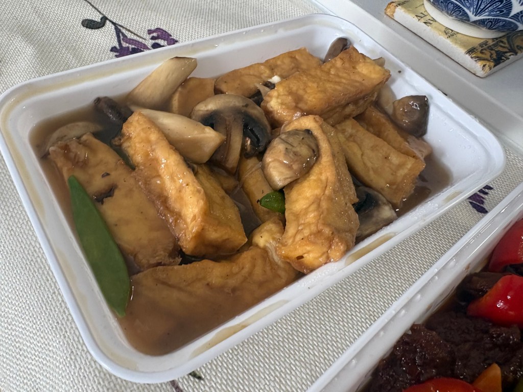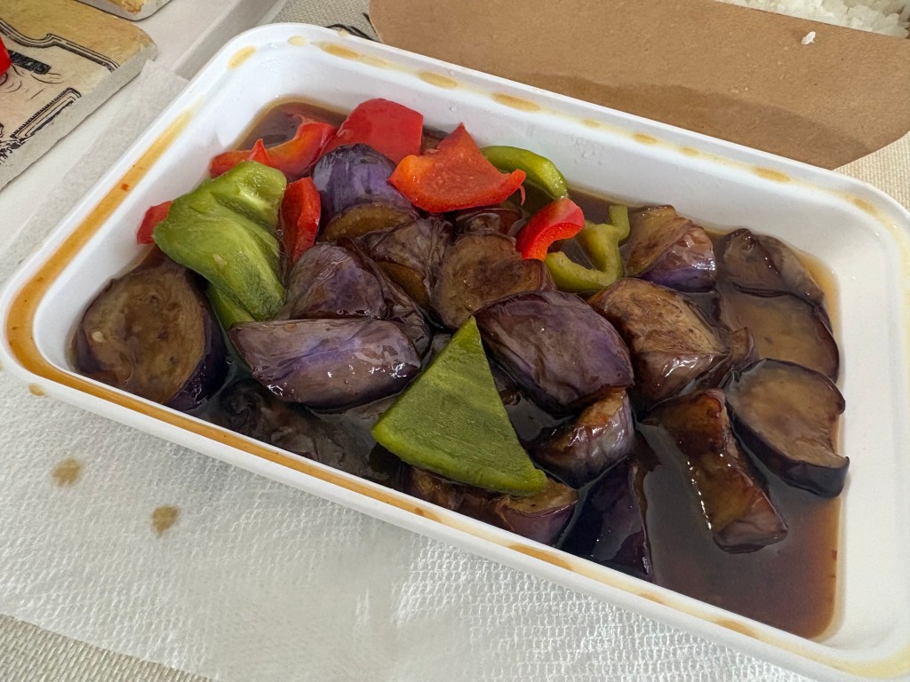 The employee on the phone recommended adding fried enoki mushrooms for texture. When probed, he responded that the mushrooms hold up really well in takeout containers. He’s correct. This dish did add a contrast to the softness of the curry and rice. Boss Lady stated she liked all the dishes, though she nibbled the most on the enoki mushrooms.