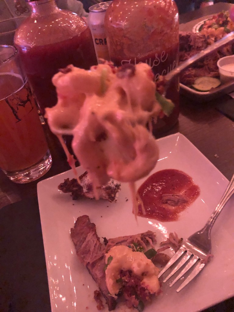 I tried a plum spritz ($7), a big wine goblet full of clinking ice, plum liquor, sparkling sake, and soda. It didn’t taste boozy, but I heard my voice getting louder as I drank. Divine Offering mentioned that the Matcha Heaven cocktail ($7) was refreshing, similar to lemonade; though she couldn’t taste the alcohol, she could feel it. While sipping her drink, she nibbled on a steamed pork bun ($5).