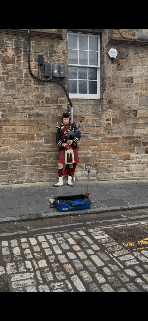 We arrived at the train station and walked up the Royal Mile. Holy, I’ve never seen such an impressive mile in my life. We walked down cobble streets aligned with towering medieval and Renaissance buildings. The piercing sound of bagpipes, mournful yet inspiring, almost stopped us in our tracks. The sight of the buildings, churches, and ancient castles was even more stunning to me than my visits to Dubrovnik or Greece. Chew Steel asked me if my father had ever visited Scotland. No, I responded, he hasn’t, likely because Scotland doesn’t have enough composers to compel him to fly over.