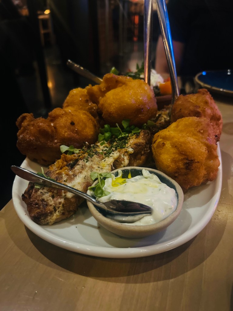 The chicken souvlaki is large enough for three appetites. On the plate were five or six golden brown honey feta beignets. Bex Oxo took a bite and exclaimed that it was like a doughnut met a dinner roll. I liked the crusty, oily exterior and the doughy, dense interior.