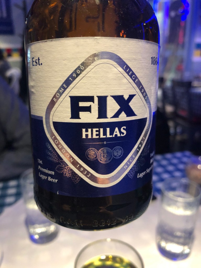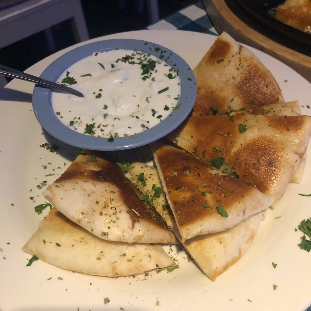 I ordered a glass of premium white wine ($13), and L picked a bottle of Fix, a Greek beer ($7.95). For food, we chose Tzatziki ($9.99), Saganaki ($17.95), Calamari ($18.95), the Mixed Grill ($28.95), and Ekmek Kataifi ($8.95). The wine was noticeably different than the house wine I drank in Greece, as it was bright and tasted like wild, unfiltered sunshine. I thought this was the ideal liquid to wash down the cheese and mountain of steaming fresh pita.