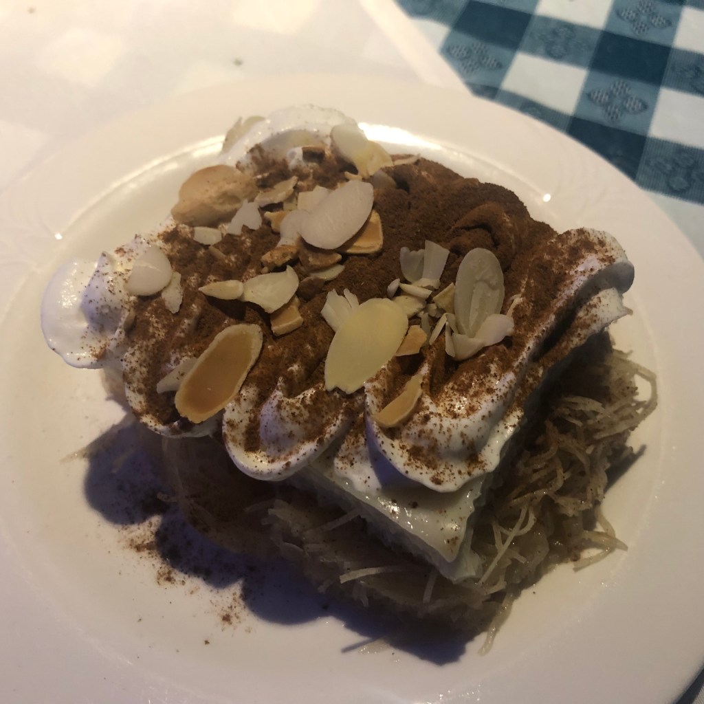 We shared Ekmek Kataifi – a concoction of lemon custard and sweet noodles. I relished the delicate crunch of the almond slivers and the spicy scent of cinnamon. When we finished our dessert, Yanni brought us two Greek Christmas cookies. The moistness and soft texture reminded me of a Fig Newton, but infinitely more delicious. Yanni has an exceptional talent for hospitality. He certainly knows what he is doing, and you can tell he loves his profession.